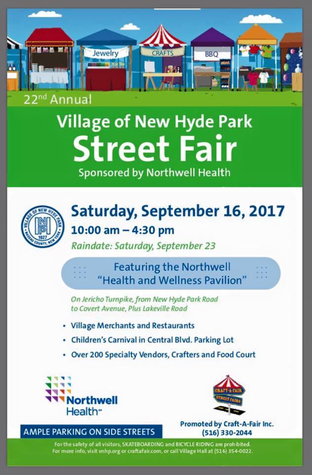 Saturday, September 16 from 10am to 4:30pm on Jericho Turnpike. Open to the public. Vendors still have time for spots. To apply, here is the link, http://craftafaironline.com/?/NewHydePark_VendorContract.pdf