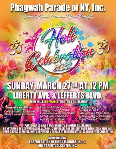 According to a local State Senate, the 34th Annual Phagwah Parade will be held in Richmond Hill on Sunday, March 27. More than 20,000 people attend the event every year. The parade usually starts around 1pm on Liberty Avenue from 133rd Street to 125th Street. Then gathering at the Phil Rizzuto public park.