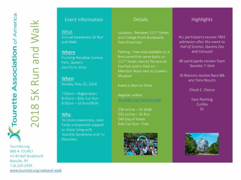 This event is organized by Tourette Association of America. Sunday, May 20. Registration starts at 7am. Open to the public. Its at Flushing Meadows Corona Park.