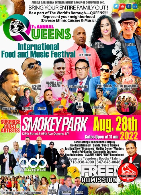 Sunday, August 28 from 11am to 8pm, Queens International Music and Food Fest at Smokey Oval Park in South Richmond Hill. This is at 125th Street and 95th Avenue. Live music and fashion show.