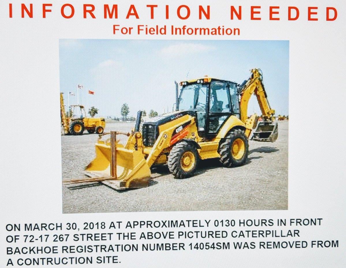 Police are investigating a theft of backhoe stolen from the yard in Glen Oaks. The incident happened on March 30 on 267th Street and 72nd Avenue. Ongoing investigation.