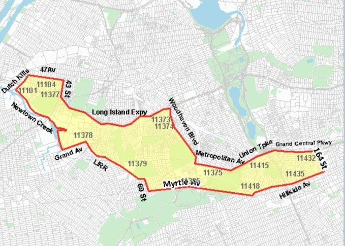 ZIP codes: 11101, 11104, 11373, 11374, 11375, 11378, 11378, 11385, 11415, 11418, 11432, 11435.