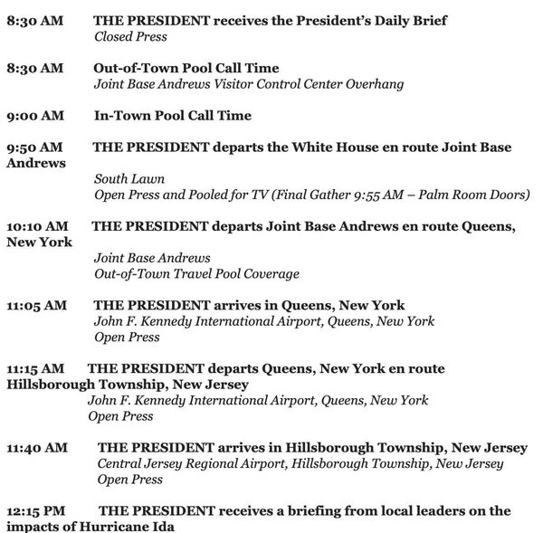 The most popular president of all time with 81 million votes, Biden will be landing at JFK today around 11am. Then head to south Jamaica, the number one voter base for Democrats to do a press brief on the flooding. After 15 minutes, Biden will head to Jersey and then return back to Queens but this time in LaGuardia Airport to do another press brief in Woodside vicinity which is the second largest voter base of Queens. The federal aid announcement will be made via media to let all know the efforts. According to Chuck Schumer's office, the benefits are around $10,000 per family with colorful brochures to join the government programs for more benefits. Here is the link, https://www.disasterassistance.gov/