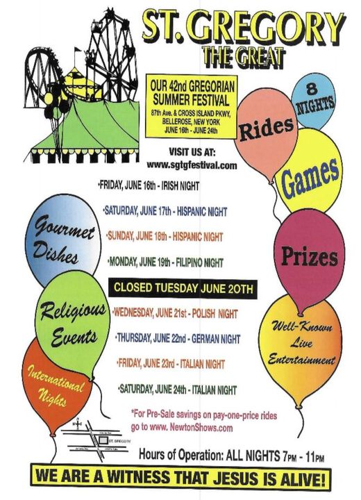 The annual festival at the local church, St Gregory in Bellerose starts tomorrow. Here is the list of events,