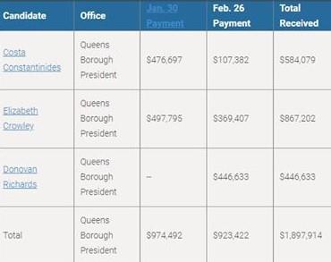 The first round, almost $1 million taxpayers fund were distributed to qualifying candidates for the Queens Borough President special election. Today, round two of matching fund announced and its a total of $923,422 allotted to three candidates. They are Constantinides, Crowley and Richards. After two rounds, the total fund distributed is $1,897,914. The election is on March 24 and early voting starts on March 14 until 22 for the public.