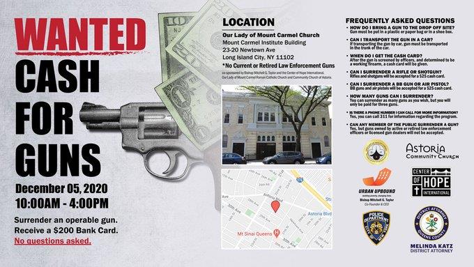 On December 5, there will be cash for guns in Astoria. This is at the church of worship. Our Lady of Mount Carmel Church, Mount Carmel Institute at 23-20 Newtown Avenue in Long Island City from 10am to 4pm. After the gun is given away for cash, all has chance to pray and go into the confession room inside the church, hopefully for a better life. Astoria and LIC reported increasing level of gun violence and all elected officials are in favor of defund NYPD due to under the party line of Democrat Socialists of America. They also support the NYC mayor's campaign of please put the guns down to combat gun violence over NYPD. The elected officials aim over gun violence is the new Green Deal as the priority.