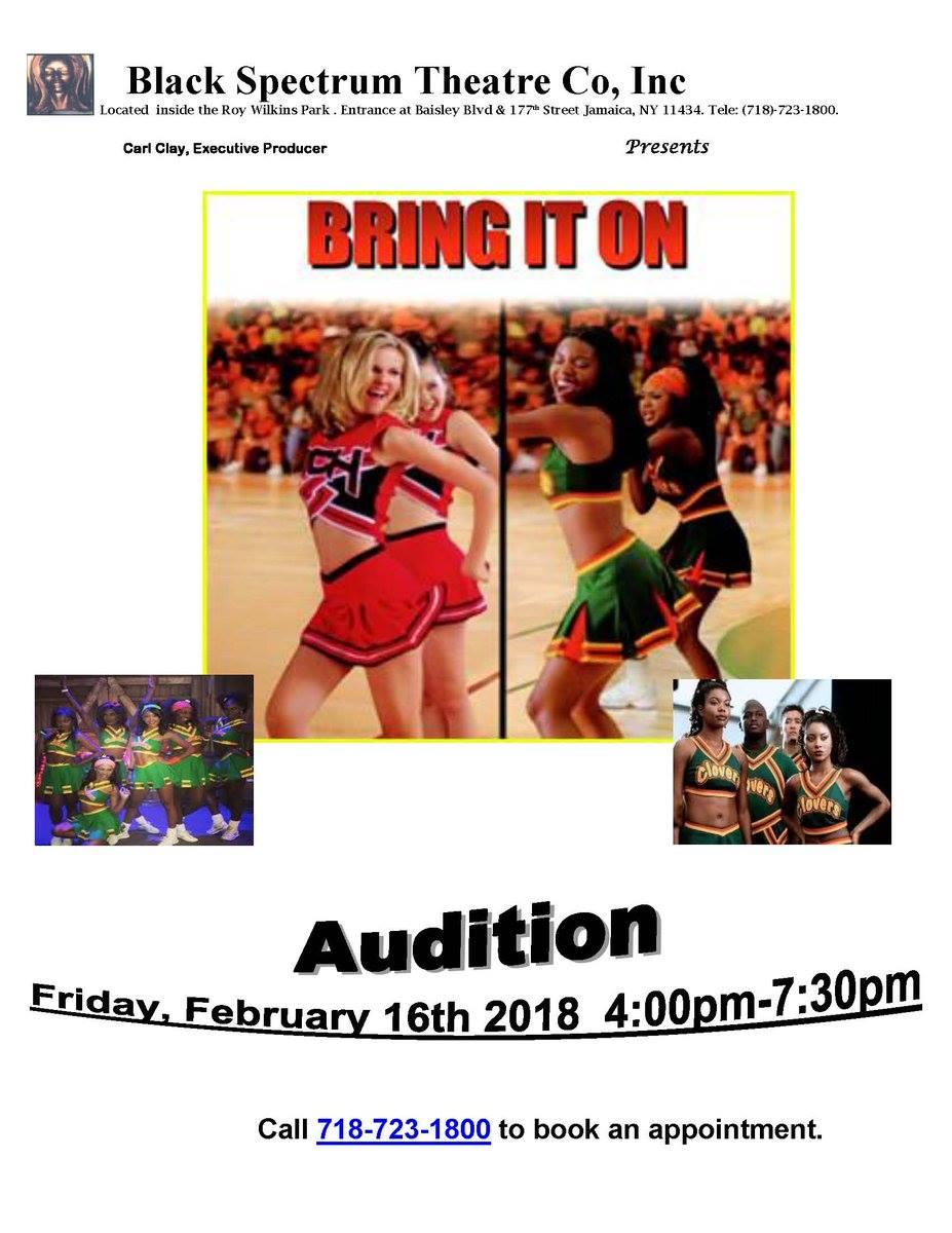 Friday, February 16 from 4pm to 7:30pm, there will be audition for the musical, "Bring It On". Call (718) 723-1800 to schedule. Open to the public.