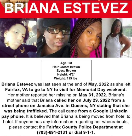 Police are seeking the public’s assistance in locating missing 28 year old Briana Estevez. She was last seen at the end of May, 2022 leaving Fairfax, VA to NY to visit for Memorial Day weekend. Her mother reported her missing on May 31, 2022. Briana called her mother on July 29, 2022 from a street phone on Jamaica Ave. in Queens, NY, telling her she was being trafficked.