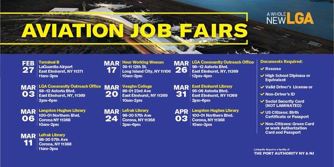 LaGuardia redevelopment announced multiple dates for job fair and career opportunities. This is from 11am to 3pm at Terminal B. Open to the public.