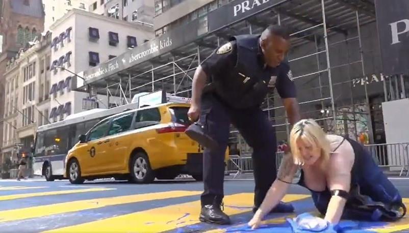 BLM mural damaged by topless transgender in front of Trump Tower with a message for the mayor