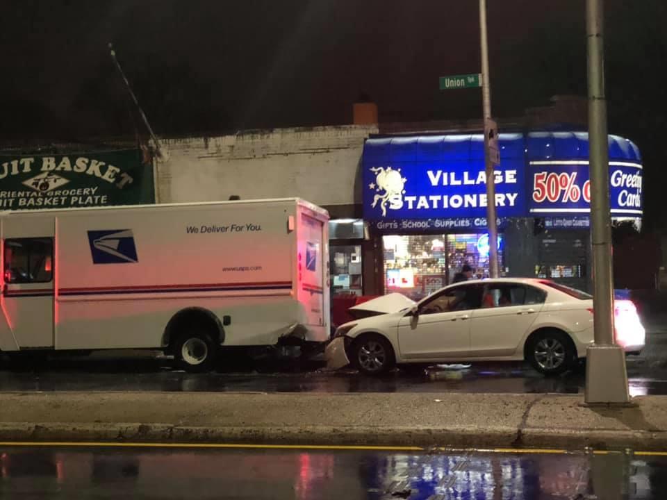 Reported from a witness that the driver was unable to turn right the last minute from left lane struck a mail truck on the corner.