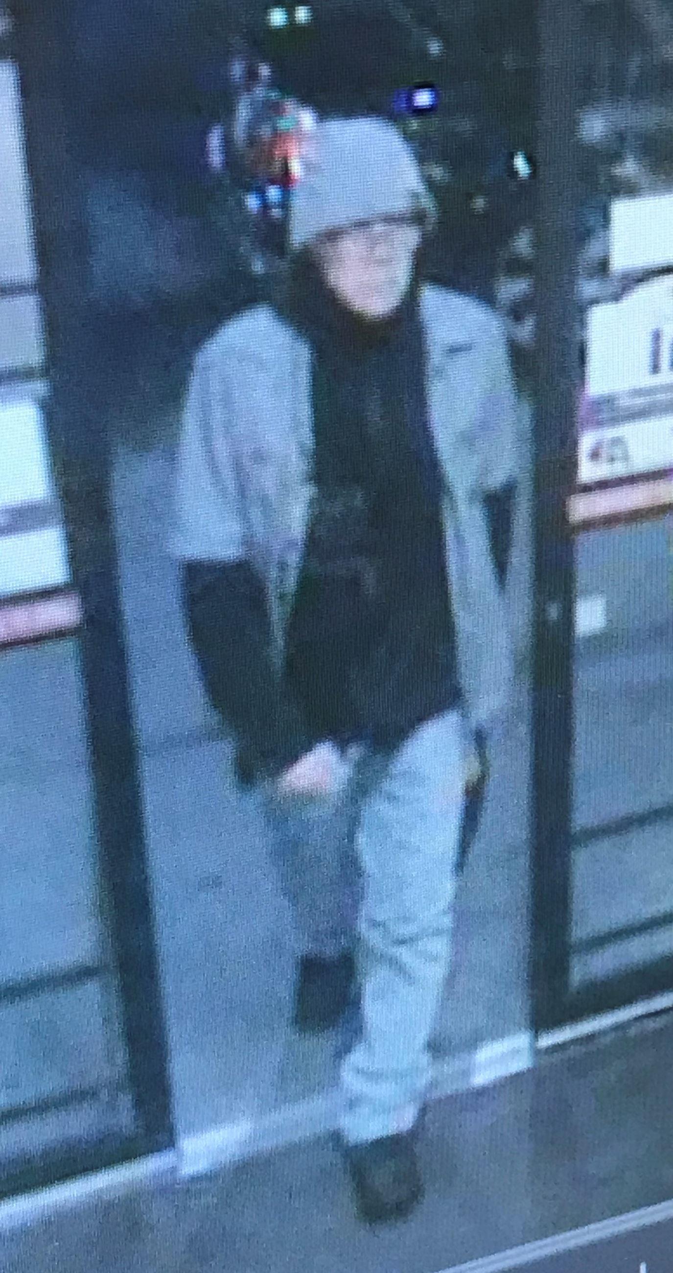 The subject is described as a white male, approximately 50 years old, 5?7? tall with a thin build. He was wearing a blue short sleeved shirt with white pinstripes over a black sweatshirt, light colored pants, a light knit hat with a brim, dark framed eyeglasses and dark footwear.