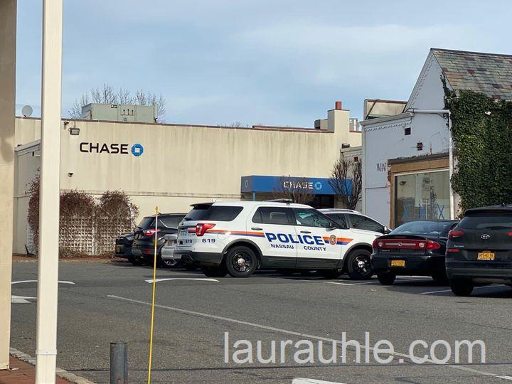 Police have closed off Glen Cove Road and The Pines reporting bank robbery. This is at Chase in the building number 425. The suspect, male, Hispanic passed a not demanding ransom around 9:30am. The teller compiled and the suspect took off on foot. Ongoing investigation.