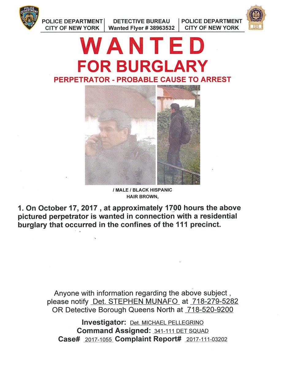 Police have disclosed details of suspect wanted for multiple burglary attempts in Bayside and Whitestone. Reported of several males, Hispanics walking around with backpacks looking to enter homes through back doors or open windows. One of the perp has been caught on surveillance on October 17 at a Bayside home on 37th Avenue and 223r Street near Cross Island Parkway and pic is released to the public. Police reported all the incidents occurs in the afternoon time. The suspect in the pic is male, Hispanic, 40's, about 5'7" and medium weight. Ongoing investigation.