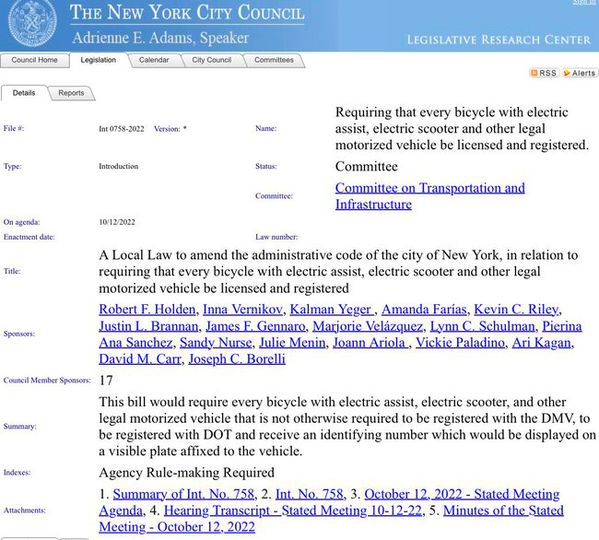 The City Council bill, 0758 requiring all electric bikes to be registered and licensed will be delayed for a long long time due to the migrant crisis in NYC.