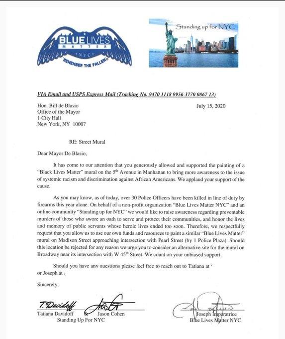 After Black Lives Matter murals, police groups submitted their proposal to the NYC Mayor's office for Blue Lives Matter mural in front of Police Plaza in downtown Manhattan. The alternative location is Broadway at 45 Street. This is to honor 30 police officers killed in the line of duty this year and quotes, "We would like to raise awareness regarding preventable murders of those who swore an oath to serve and protect their communities, and honor the lives and memory of public servants whose heroic lives ended too soon."
