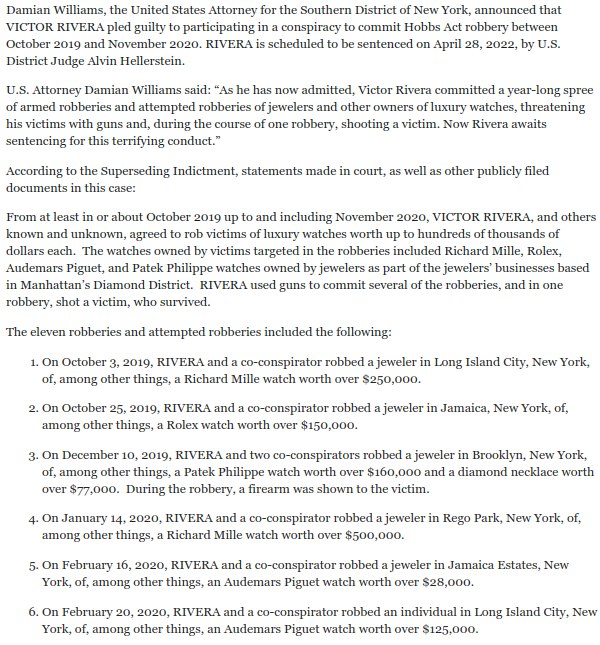 The suspect committed eleven robberies and attempted robberies of luxury watches in NYC, NJ and Long Island, including shooting a victim during one robbery.