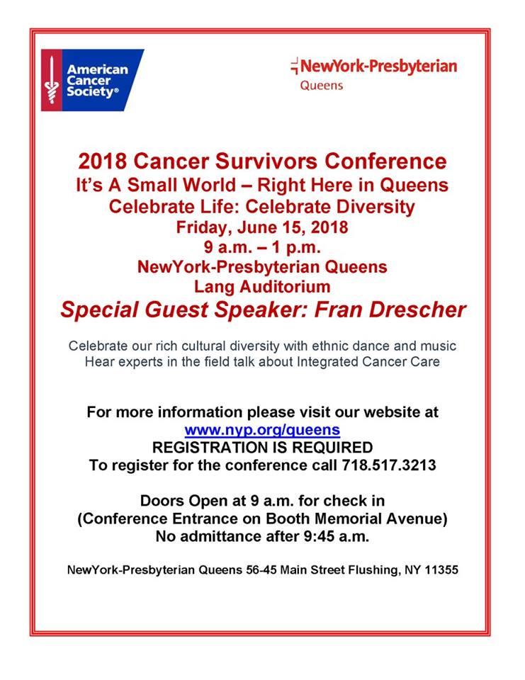Flushing native Fran Drescher of the TV Show, The Nanny will be in town to speak on cancer. June 15 at 9am in the former Booth Memorial Hospital in Flushing. Open to the public.