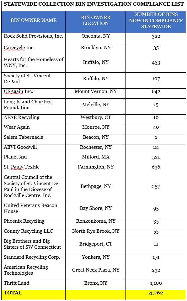 On Monday, January 15, the NYS Attorney General stated all collection bins in NYS must report whether the donated items will be used for profit or charity. People can report if the collections bins are not posted with their purpose. Almost 5,000 collection bins have disclosed their intentions. All collection bins must display the name, address, phone number and other details. This issue came to light after residents complained to the Attorney General's office regarding the company, Thrift Land which placed over 1,000 collection bins in NYC tricking people it was for charity but investigation showed it was for profit by selling clothes and other items disposed by the public into the collection bins. The company settled with fines over $700,000. Each bin must show purpose of either donated items will be used for charitable purpose or used for profit.