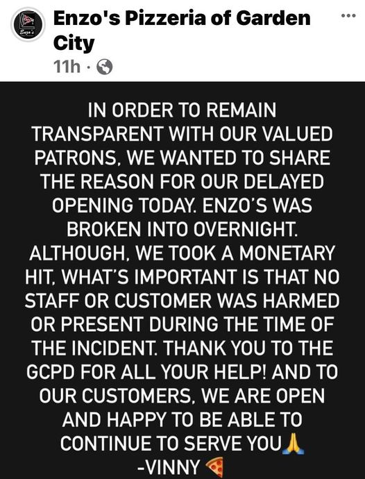 In Garden City, a local pizzeria was broken into last weekend.