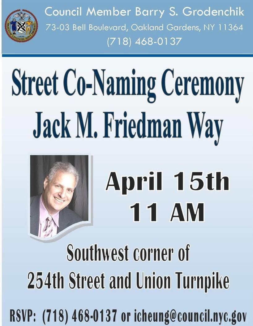 April 15 at 11am, the corner of Union Turnpike and 254 Street will be renamed as Jack Friedman Way. Friedman was the president of Queens Chamber of Commerce and a long time activist in the community. The sign will be posted on the southwest corner. Open to the public.