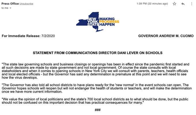 After Mayor de Blasio announced in a press brief today, NYC public schools will be open in September, Governor Cuomo issued a press statement such decision are made by the state government and not local. Cuomo will announce the plan when the time is right. Until then NYC Mayor also has to wait and be patient along with the rest of local governments and the parents.