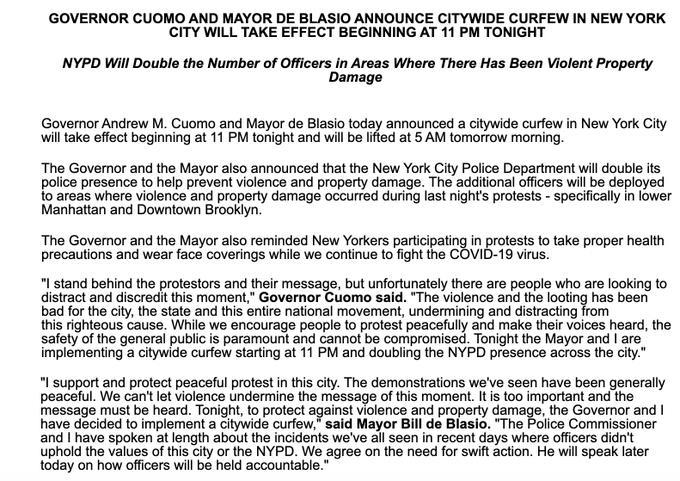 Curfew announced in NYC