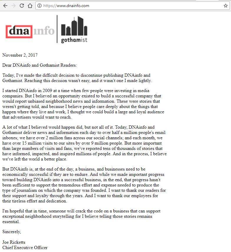 Absolutely unnecessary action. Two well known news media in NYC, DNAInfo and Gothamist were shut down after employees voted to unionize. Workers were told to leave as all offices are shut down. The company CEO issued a press statement to all readers regretting the decision. More than 100 journalists are now out of work. The announcement came around 5pm unexpectedly shocking workers and readers.