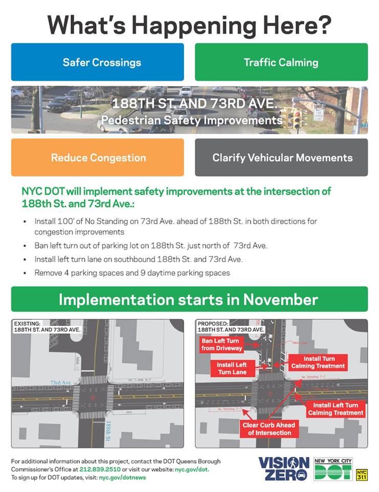 The Dept of Transportation will start adding safety improvements at the intersection of 188 Street and 73rd Avenue in Fresh Meadows.