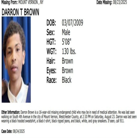 Darron T Brown, male/black/16, 5'8" & 130lbs, from Mount Vernon, Westchester County.
