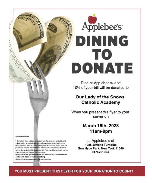Dine at Applebee's and 10% of the bill will be donated to the local Floral Park church, Our Lady of the Snows.