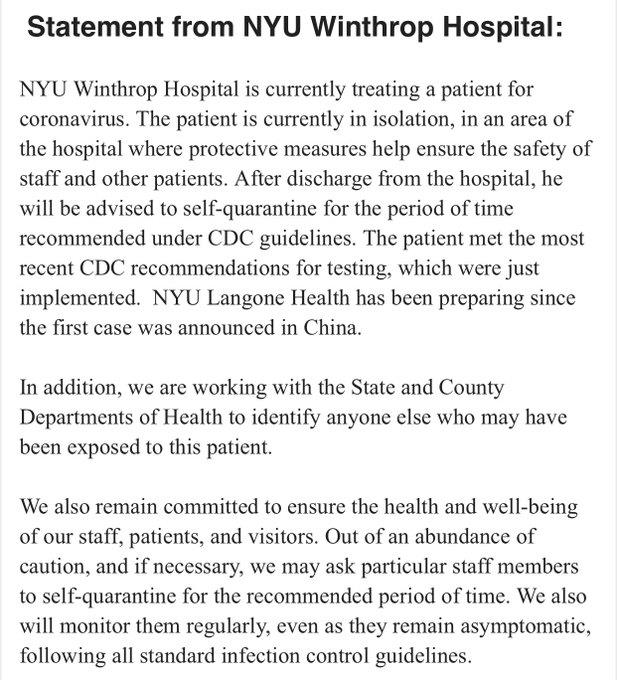 According to multiple sources, a doctor working at the hospital in Glen Oaks New Hyde Park border was in China and returned to NYC two weeks ago. Today, Governor Cuomo reported the first case of coronavirus in Nassau County. The patient is a male, 42 year old who was employed as a doctor. However, Cuomo is not disclosing details if both are the same person due to panic control in NY where already 22 people tested positive for cornavirus as of March 5. The patient is currently at Winthrop Hospital in Mineola. The Nassau County health officials are awaiting for County Executive Laura Curran's press statement at 3pm.