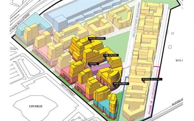 The latest update on Willets Point to replace auto shops and other businesses has plans to build 1,100 unit affordable housing, a plan for soccer stadium and retail, open space, a school, new police and fire stations and another residential building.