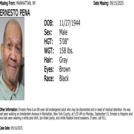 Ernesto Pena, Male/Black/80 years old from Manhattan, NY. The missing may be in need of medical attention.