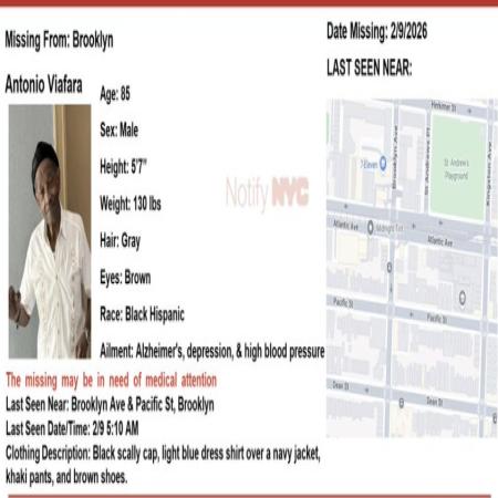 Antonio Viafara, M/BH/85 from Brooklyn Ave and Pacific St, Brooklyn. The missing may be in need of medical attention.