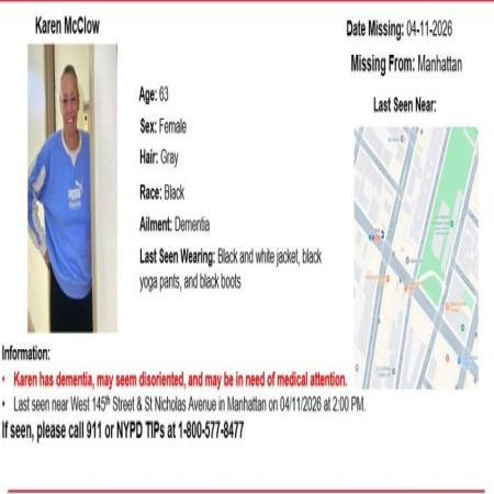Karen McClow, Female/Black/63. Last seen near West 145th Street & St Nicholas Avenue, Manhattan. Karen has dementia, may seem disoriented, & may need medical attention.