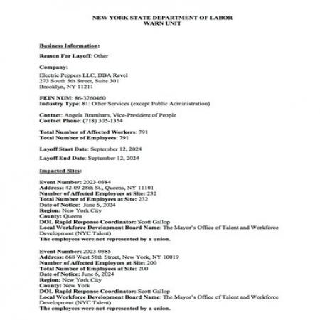 In a message to the Dept of Labor, the announcement was disclosed.