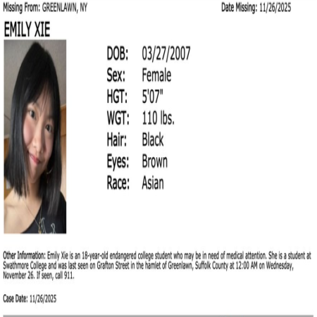 Missing College Student Alert: Emily Xie, Female/Asian/Age 18, 5'7" tall, & 110 lbs, from Greenlawn, Suffolk County.