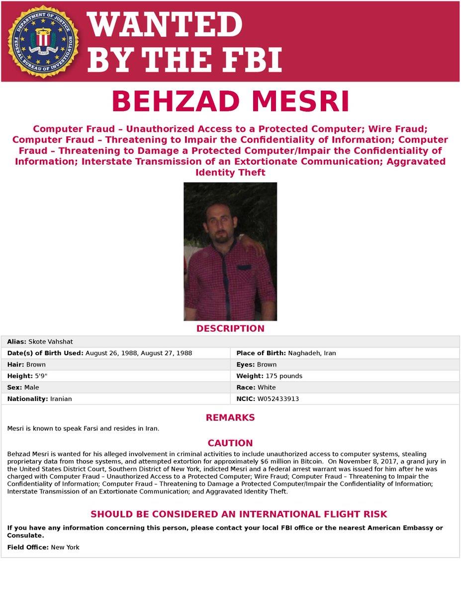 Behzad Mesri of Iran is now the most wanted person on the FBI's list. Reported as the suspect for hacking inside HBO. Ongoing investigation.