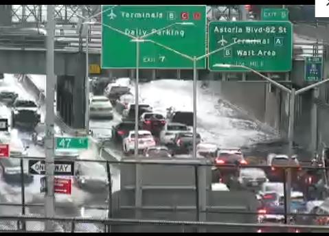 Grand Central Parkway eastbound at LGA Exit, heavy delays due to flood watch. Two lanes closed. NYC DOT is on the scene monitoring the condition.