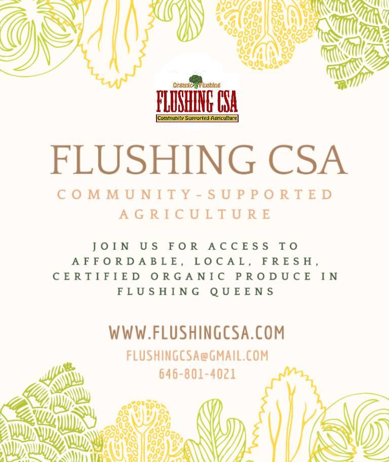 Flushing CSA (Community Supported Agriculture) is a volunteer co-operative group of local Flushing (Queens) residents working with Golden Earthworm Organic Farm and JustFood to bring fresh, locally-grown, organic produce to our community. Details at https://flushingcsa.com