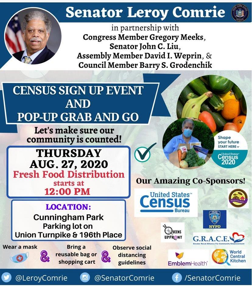Local politicians are distributing free food for all to complete census for NYC to get money from the fed. August 27 at 12pm. Bring your own bag and don't dump it in the park after eating due to sanitation dept budget cut which will pile up like Flushing Meadows Corona Park. The food is paid by taxpayers.