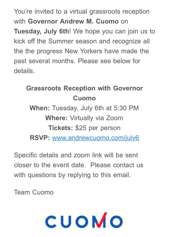 Tuesday, July 6 at 5:30 via Zoom, the governor is having a fundraiser and it's only $25 per person. You can see the governor like on TV and there is no guarantee he will say hello to you personally. This event is open to the public.