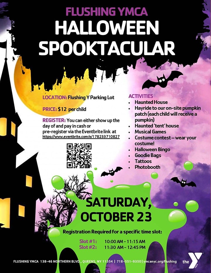 Saturday, October 13 at 10am. This is on 138-46 Northern Boulevard in Flushing. Tickets are $12 per person. This is open to the public. Here is the link to get tickets, https://www.eventbrite.com/e/flushing-y-family-halloween-event-tickets-178234222357