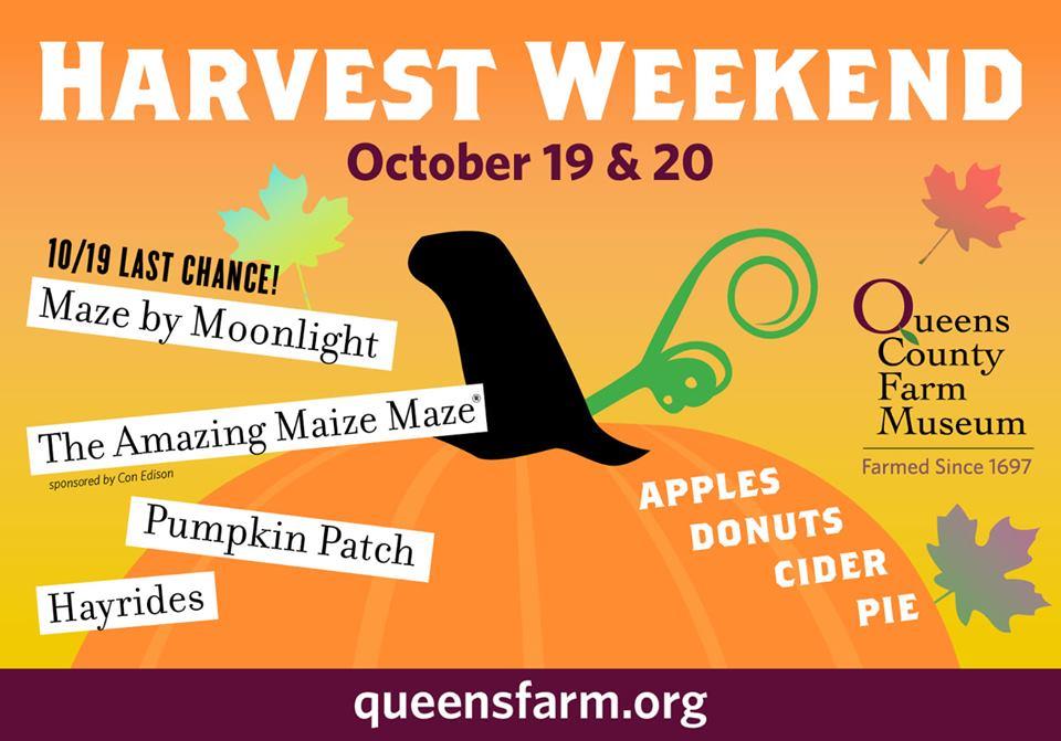 October 19 and 20 at the Queens County Farm on Little Neck Parkway and 73rd Avenue in Bellerose. No entrance fee but charge for various activities. Pumpkin patch, pony rides, petting zoo is from 11am to 4:30pm. The Maze by Moonlight stays open until 9pm. Open to the public.