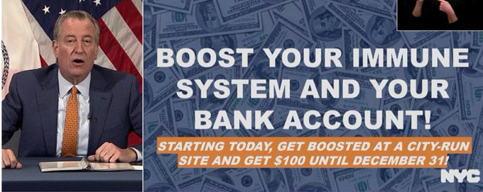 The NYC Mayor announced a $100 gift card for all who take the booster jab from today until December 31. The good news is both the Mayor and Governor are on the same page with no more shutdowns.