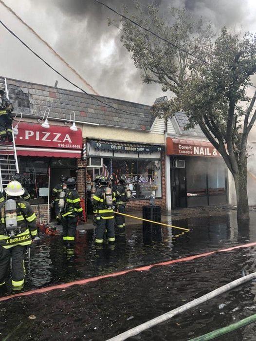 Fire at 41 Covert Avenue. The fire started around 6am inside the restaurant. 5 stores destroyed from the fire including another restaurant Capo, nail salon, barbershop, martial arts store. Another 5 stores have been damaged from the fire. The gas line is ruptured all around causing fire to store extensions. Park Place restaurant is where the fire started. More than 100 firefighters are working at the scene.