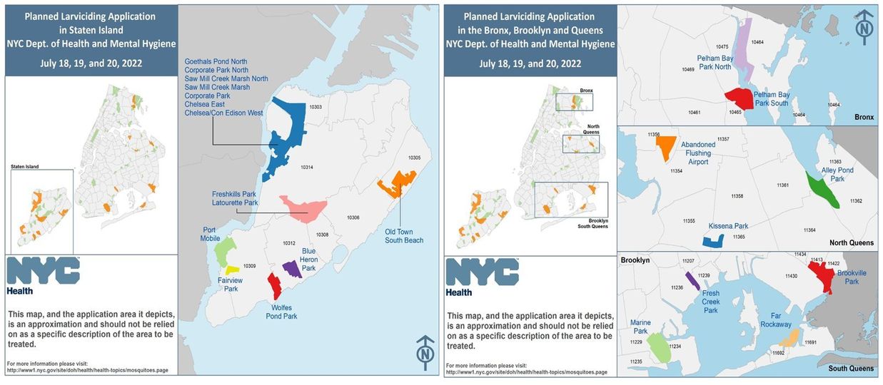 Starting July 18, 19 to 20, the NYC Health Dept announced aerial based mosquito larviciding in Queens, Staten Island and Brooklyn from 6am to 7pm.