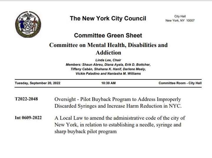 Today there was a meeting attended by selected NYC Council members to introduce a buy back program for used needles already injected for money. The discussion is a pilot program under harm reduction from kids, seniors and others from being safe.
