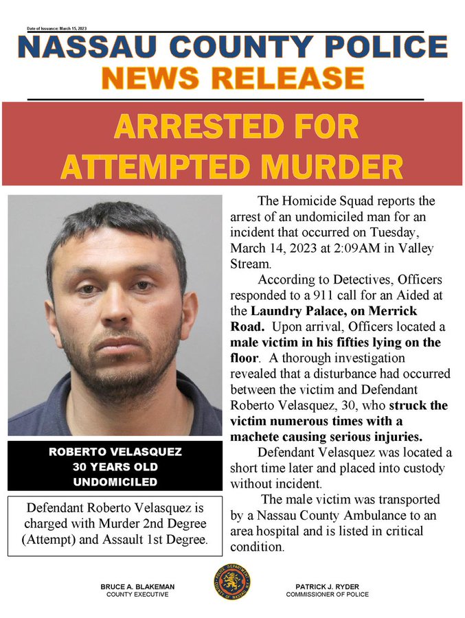 Defendant Roberto Velasquez is charged with Murder 2nd Degree (Attempt) and Assault 1st Degree.  He will be arraigned on Wednesday, March 15, 2023, at First District Court, 99 Main Street in Hempstead. (From NCPD)